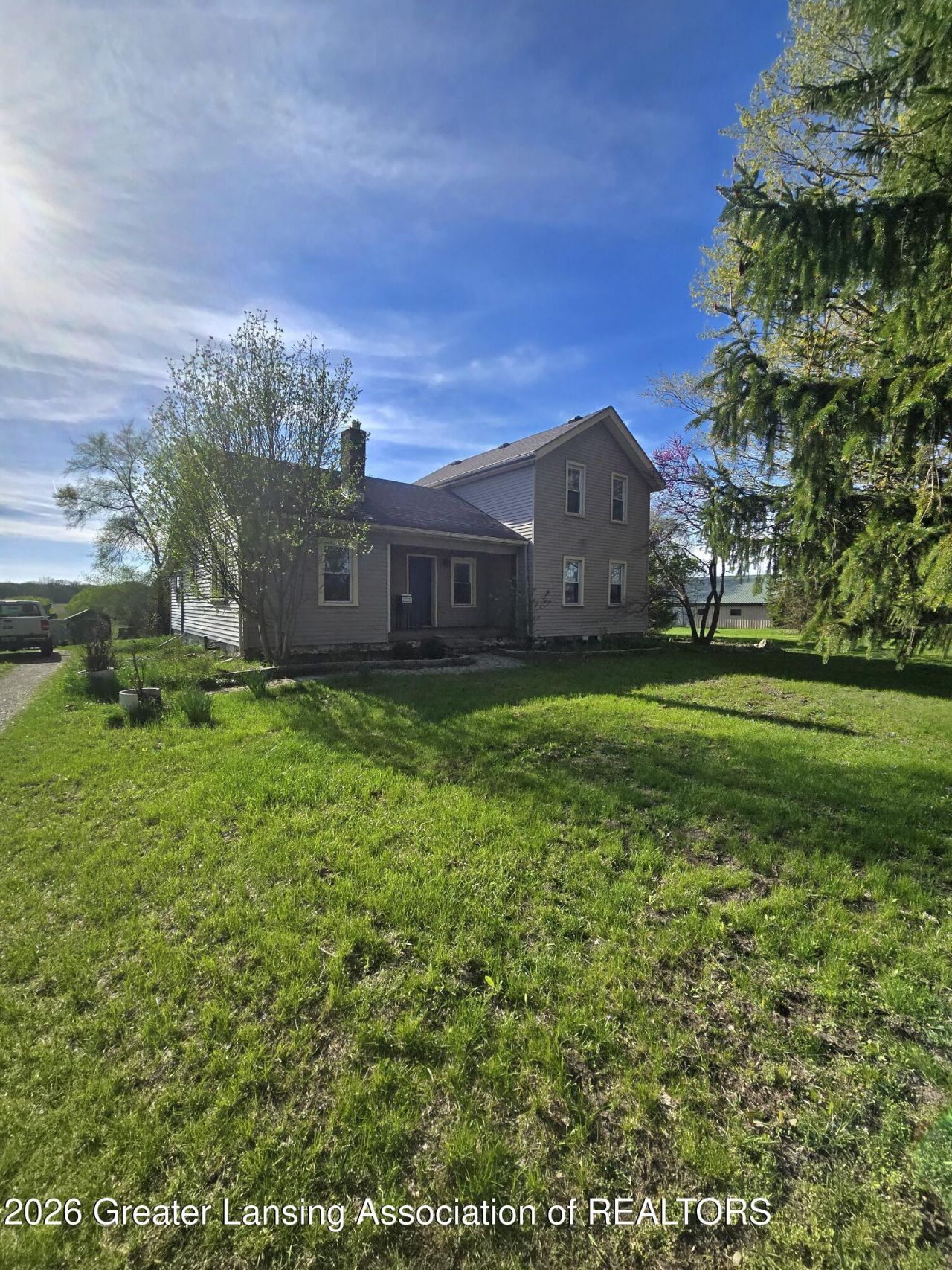 Mason Schools, Leslie address. Rare find 10 acres!! 3 bedrooms and 1 full bathroom. 2 electric fireplaces and one pellet stove. All appliances remain including stackable washer and dryer. Large dining room has a wood pellet stove and is open to the kitchen and living room. The living room has an electric fireplace and so does the primary bedroom. One bedroom on the first floor and the other 2 are upstairs. Outside you will find a couple of sheds and an old silo that is in great condition. The property is in a T shape.
