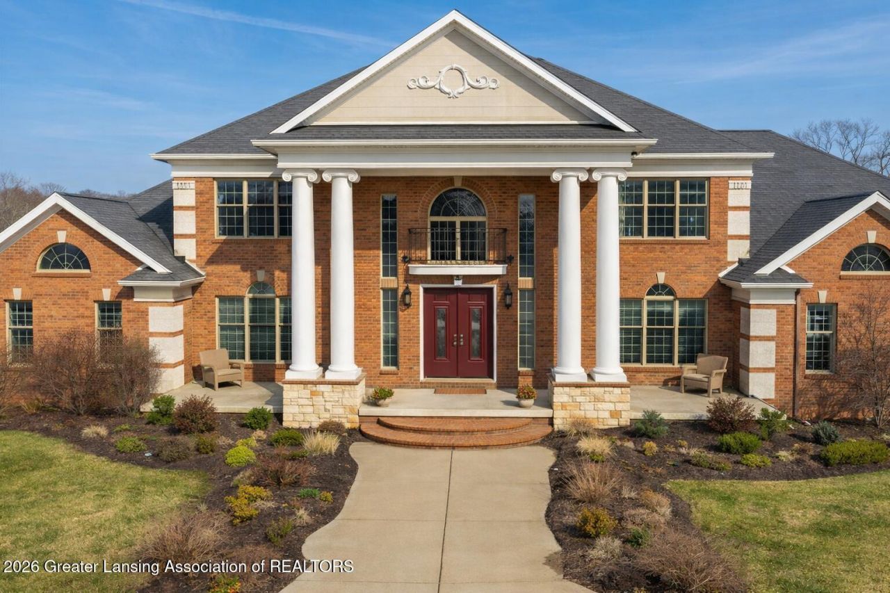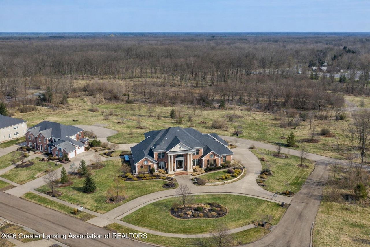 Okemos - Nestled in the highly sought after Ember Oaks Subdivision! Enjoy this magnificent almost 10,000 sq. ft. all brick 5-6-bedroom 7 bath manor home majestically positioned on a circle driveway on over a 1-acre parcel in a prime location in this neighborhood! Spectacular 2-story double curved staircase with an amazing chandelier (valued at $28K) and inlaid tiled floors offers access to the beautiful formal dining room and living room with hand painted ceilings. The two- story great room is anchored by a fireplace plus floor to ceiling windows with fabulous custom beamed ceiling accents in this amazing former Parade Home! Stunning solid panel wood-stained interior doors and extensive trim throughout, A beautiful kitchen includes a butler pantry, high-end appliances, planning center, wet bar, center island, and informal eating area with amazing windows and nature views plus a morning room breathing in the Eastern sunlight! A main- floor library with lovely built-in bookshelves plus a main floor bedroom, exercise room or second primary with its own full bath! An extra room on the main floor could easily be made into another bedroom or second study (see list agent for details). The spacious mudroom/drop zone allows access to the ample 4 car garage plus adjacent utility half bath. Over-the-top second floor primary suite complete with its own private viewing deck, coffee bar, walk-in closets plus a dreamy, oversized bath with a large walk-in shower, soaking tub and double vanities with a second-floor laundry room including appliances plus a back staircase for accessibility. Two additional large ensuite bedrooms each with a walk-in closet and full baths. A dramatic second floor mezzanine with views of the foyer and great room. If this is not enough, the full walk-out finished lower level may be! Game area, exercise room, media space, wet bar/kitchen, extra tenant space, movie theater plus a full bath. 5th bedroom plus loads of storage! Need more bedrooms? See list agent for ideas. Loads of upgrades throughout with a whole house generator, whole house attic fan, security system, central vac, electric switch to lower the chandelier, Pella windows, high end window treatments and so much more. close to MSU, highway access, eateries, shopping and more. Make your dreams come true.