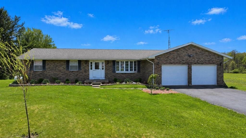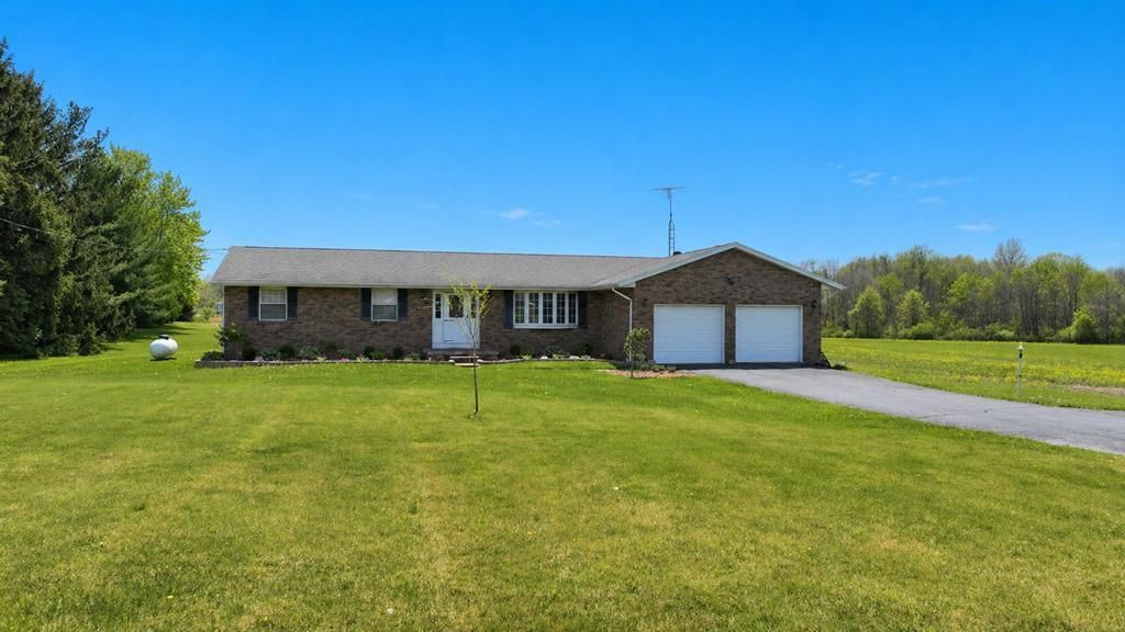 Open House Sunday 12-1:30! Discover this inviting country home situated on approx 2 acres in Ontario School District. This well-maintained 3 BR, 2 BR ranch offers comfortable single-level living with thoughtful updates throughout. The main level features a primary suite w/private bath, main floor laundry, a formal living room, formal dining room, and a spacious family room. The family room opens to a rear deck overlooking the partially fenced yard, perfect for relaxing, entertaining, pets, and playsets. The kitchen was tastefully updated in 2025 with freshly painted cabinets, new hardware, countertops, dishwasher, and microwave. Recent upgrades include a new electric heat pump furnace with propane backup and ductwork (2023), plus a new water heater, French doors, family room flooring, and a 10x16 shed (all in 2025). New roof in 2018. Partially finished basement with recreational room. 2 Car attached garage. Enjoy the country setting with nice landscaping on this spacious lot.